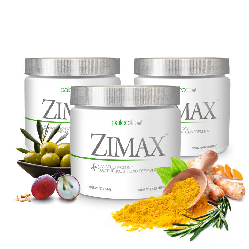 Zimax® es una mezcla patentada que contiene: extracto de raíz de cúrcuma con 95% de curcumina, extracto de hoja de olivo 10:1, extracto de semilla de uva (Resveratrol) con 95% de OPC (procianidinas oligoméricas) y extracto de hoja de romero.