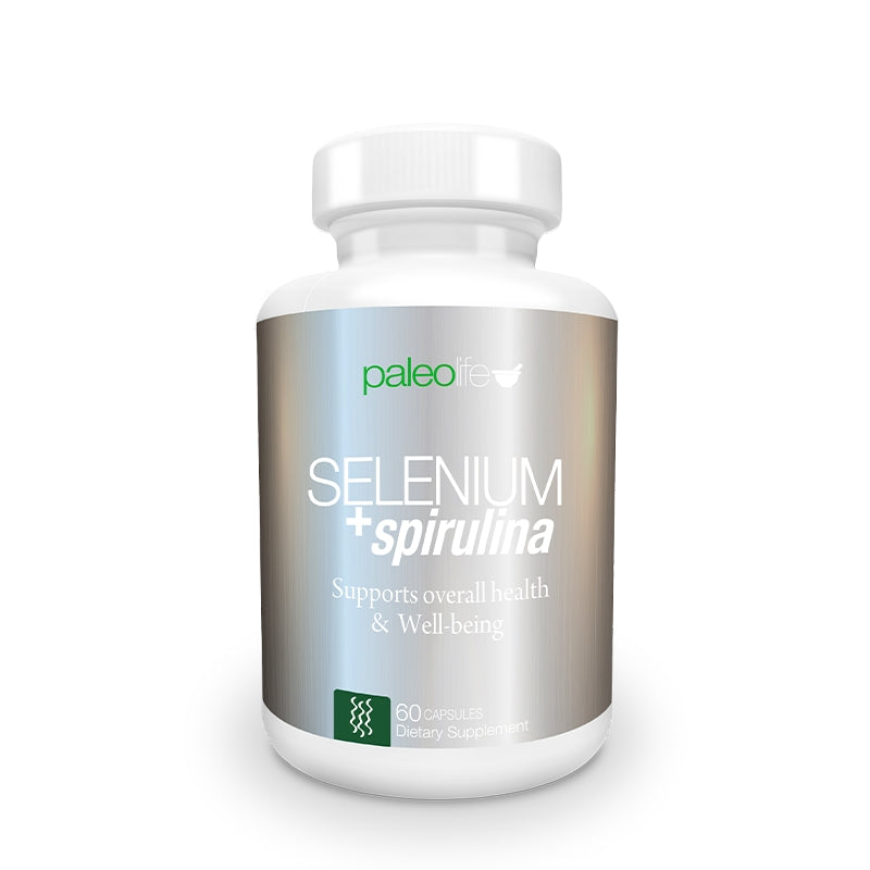 Selenium + Spirulina contiene selenio en forma de selenito de sodio (200 mcg) y polvo de Arthrospira platensis (350 mg).